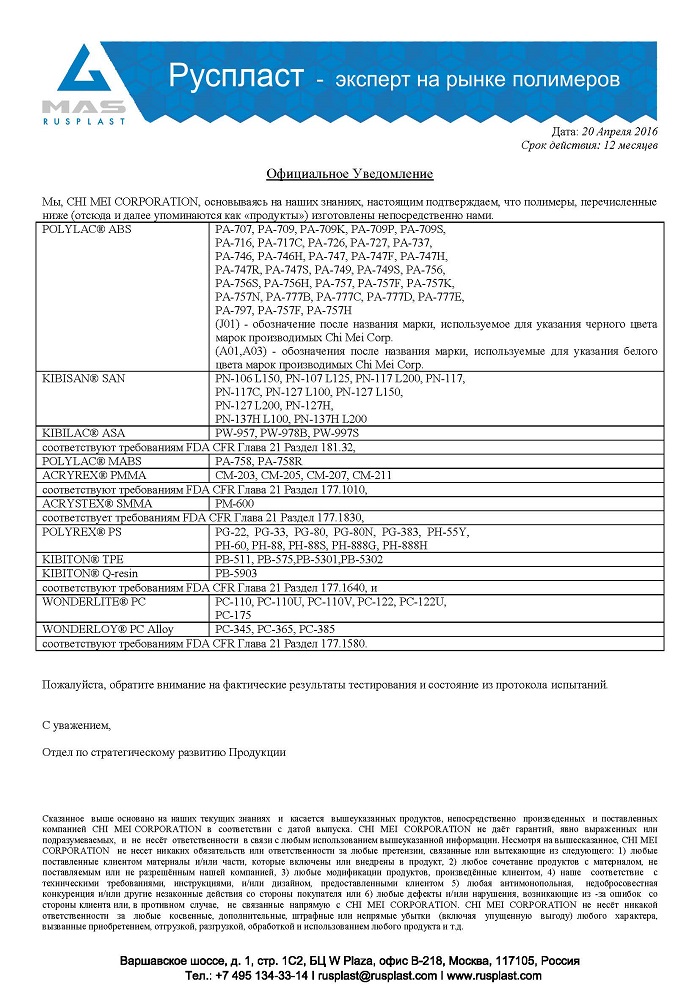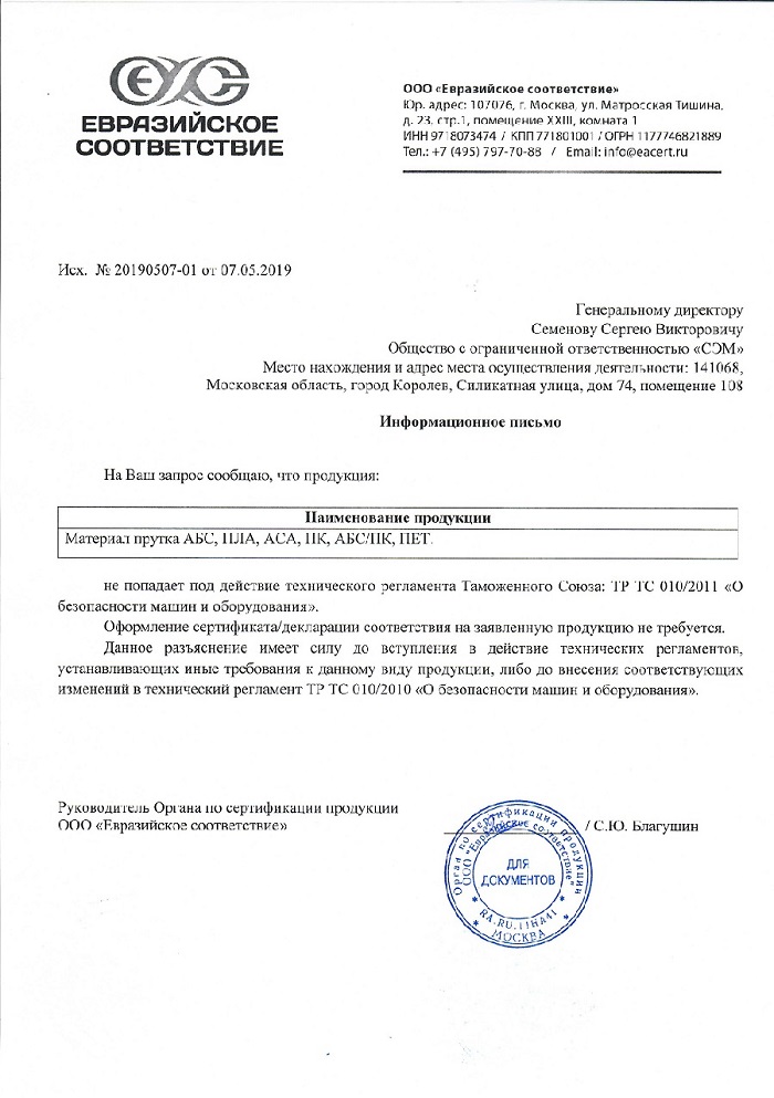 В настоящее время филаменты не подлежат обязательной сертификации. Однако ответственные производители, которые предоставляют гарантии на свою продукцию проходят добровольную сертификацию. Таким образом, сторонняя независимая организация подтверждает то, что материал соответствует заявленным характеристикам. Для потребителя – это огромный плюс!